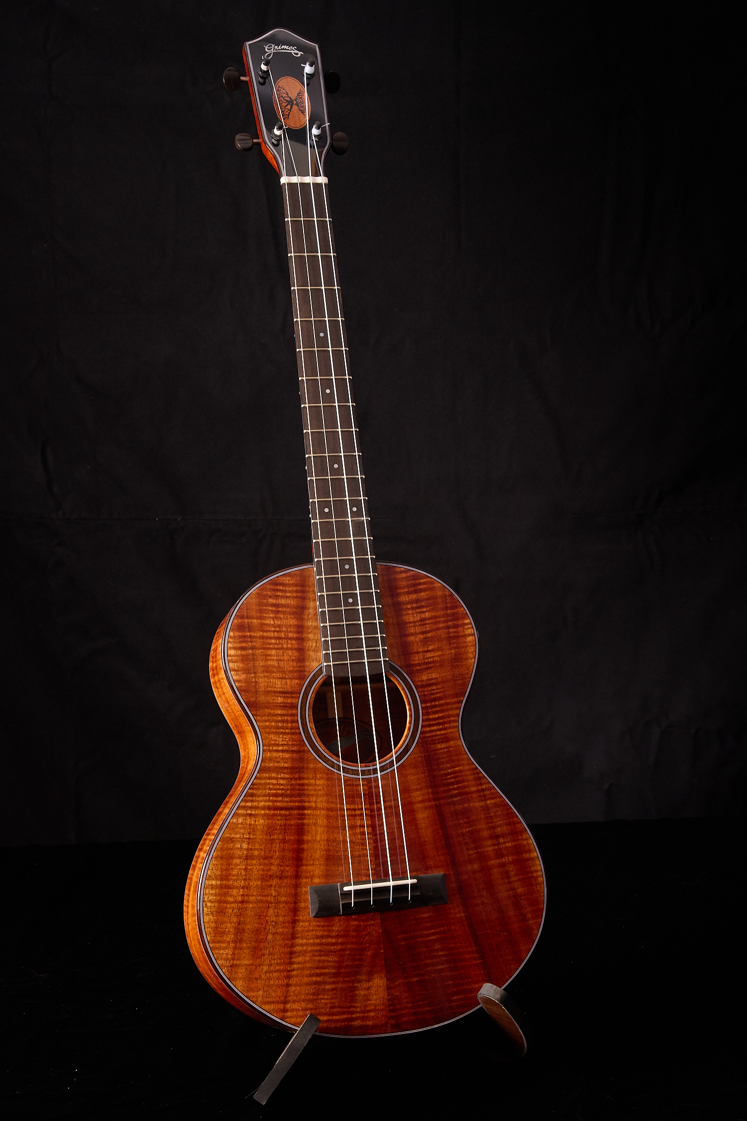 This family of ukuleles was constructed of aged koa hardwood from the island of Maui. It was intended to represent, and pay homage to, the families affected by the fires of August 8, 2023. The Treecovery Hawaii logo on the peghead is made of kiawe wood from a tree that was burned in the Lāhaina fire, and inlaid into the ebony veneer. The Treecovery Hawaii logo on the back is engraved into the koa, and finished over with 12 coats of lacquer. The four sizes are, from smallest to largest: soprano, concert, tenor, and baritone. For more information, please contact Steve Grimes at grimesguitars.com. (grimesguitars@gmail.com).